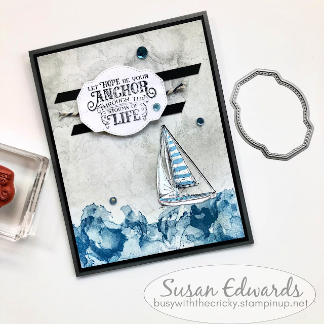 To finish the card, I cut out the sailboat and affixed it to the front of the card. I cut two .25-inch strips of black cardstock and a length of twine. I stamped the sentiment on a tag (which was also stamped ever-so-lightly with the background stamp) and using Stampin' Dimensional dots, I raised the sentiment above the decorative element. I used Stampin' Blend markers and darkened the color of the sequins before applying them to finish the card front.