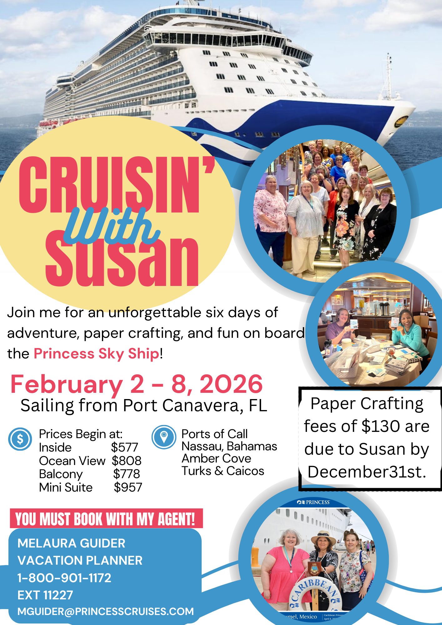 Join my annual Stampin’ Cruise! Enjoy the fun and adventure of life aboard a cruise ship while also enjoying your favorite hobby, paper crafting!! We will craft on the sea days only, with the ability to come and go so that you can also enjoy the shipboard programs and fun!